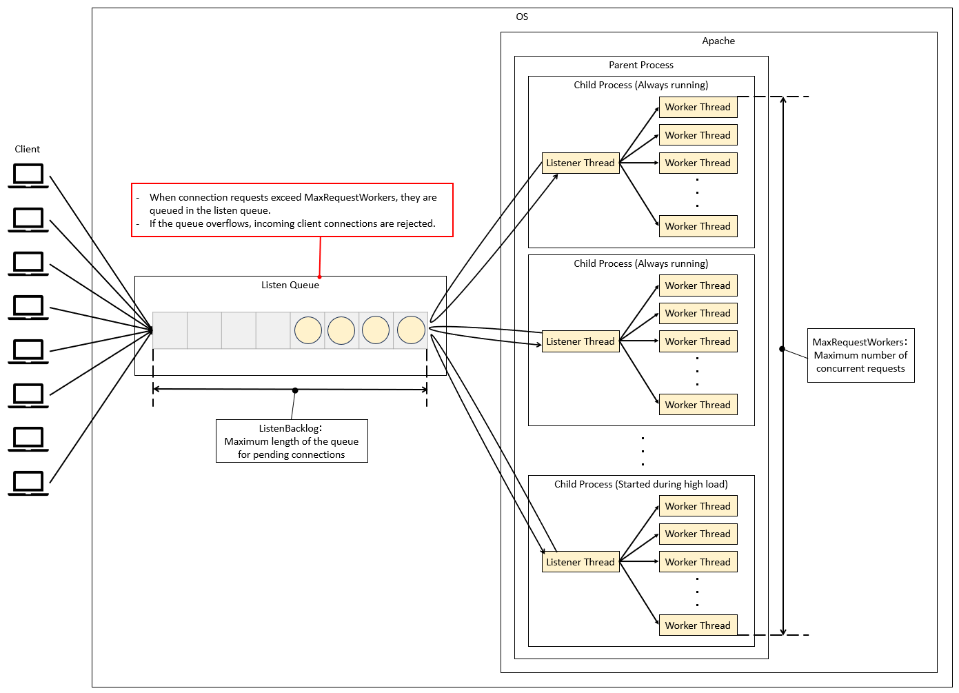 By configuring MaxRequestWorkers, you can limit the total number of concurrent connections for the entire Apache server (known as MaxClients in Apache 2.4 and earlier). Apache also has other parameters related to rate limiting, such as ListenBacklog, which controls the length of the listen queue. The diagram below illustrates the relationship between MaxRequestWorkers and the listen queue.