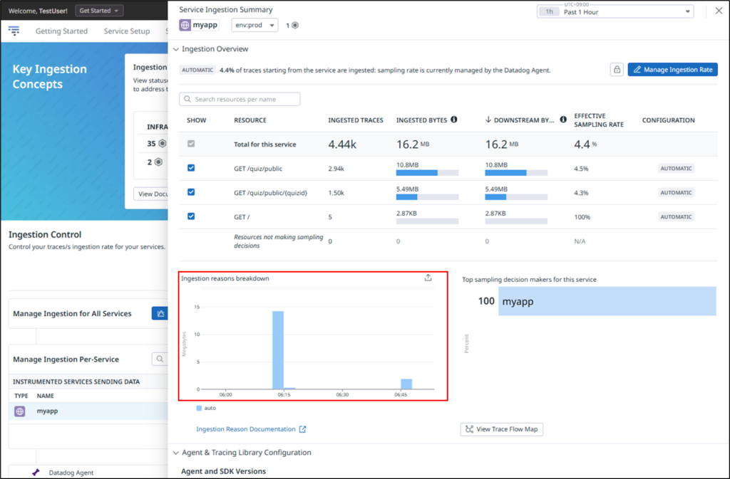 以下の通り、Ingestion reasons breakdownに取り込まれたデータ量が記録されていることが確認できます。左側のスパイクがHead-based SamplingとError Spans Sampling の値をデフォルト値の10、右側のスパイクがHead-based SamplingとError Spans Sampling の値を5にした結果となっており、サンプリング数を低くすることで取り込まれるデータ量を抑えられることが確認できました。