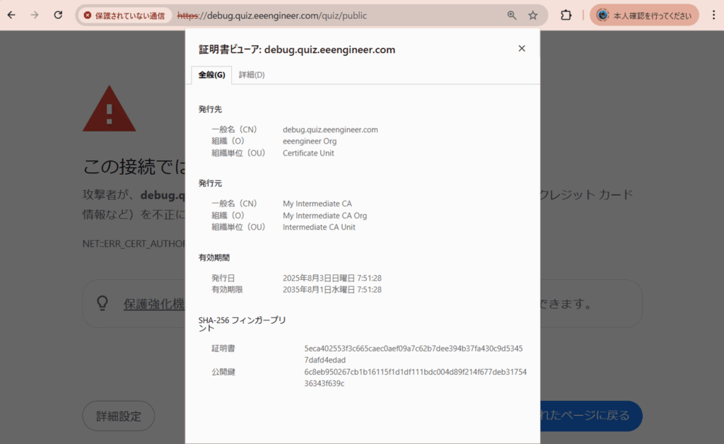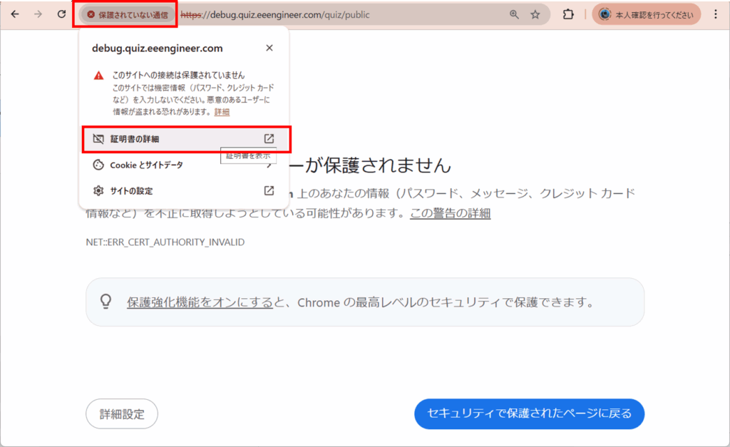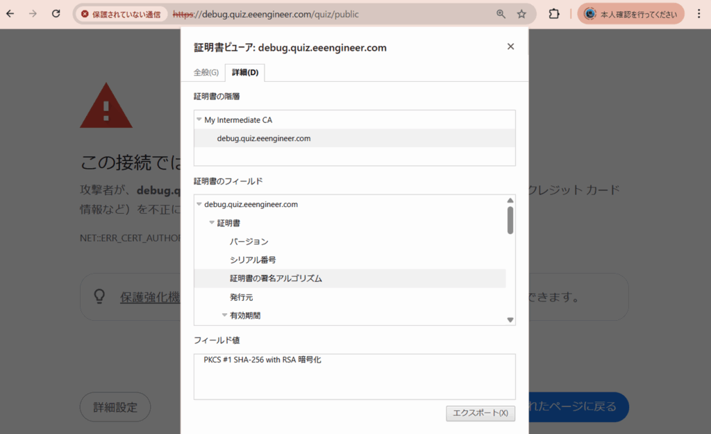 <h3>ITインフラエンジニア向けスキルアップクイズ</h3>上記のとおり、問題なくWebサイトにアクセスできた場合は、ルート証明書自体は正しいファイルである可能性が高いと考えられます。この場合は、ルート証明書が truststore に適切に登録されていない、またはアプリケーションの不具合といった別の要因を疑い、調査を進めてください。